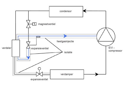Een EVI-compressor neemt een klein deel van de warmte (energie) die het via compressie toevoegt aan het koelgas terug, om zichzelf te ‘verwarmen’.