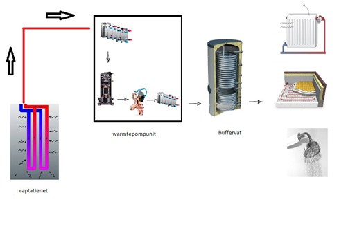- Een captatienet gevuld met water met milieuvriendelijk antivriesmiddel wordt op minimaal één meter diepte in uw tuin geïnstalleerd.